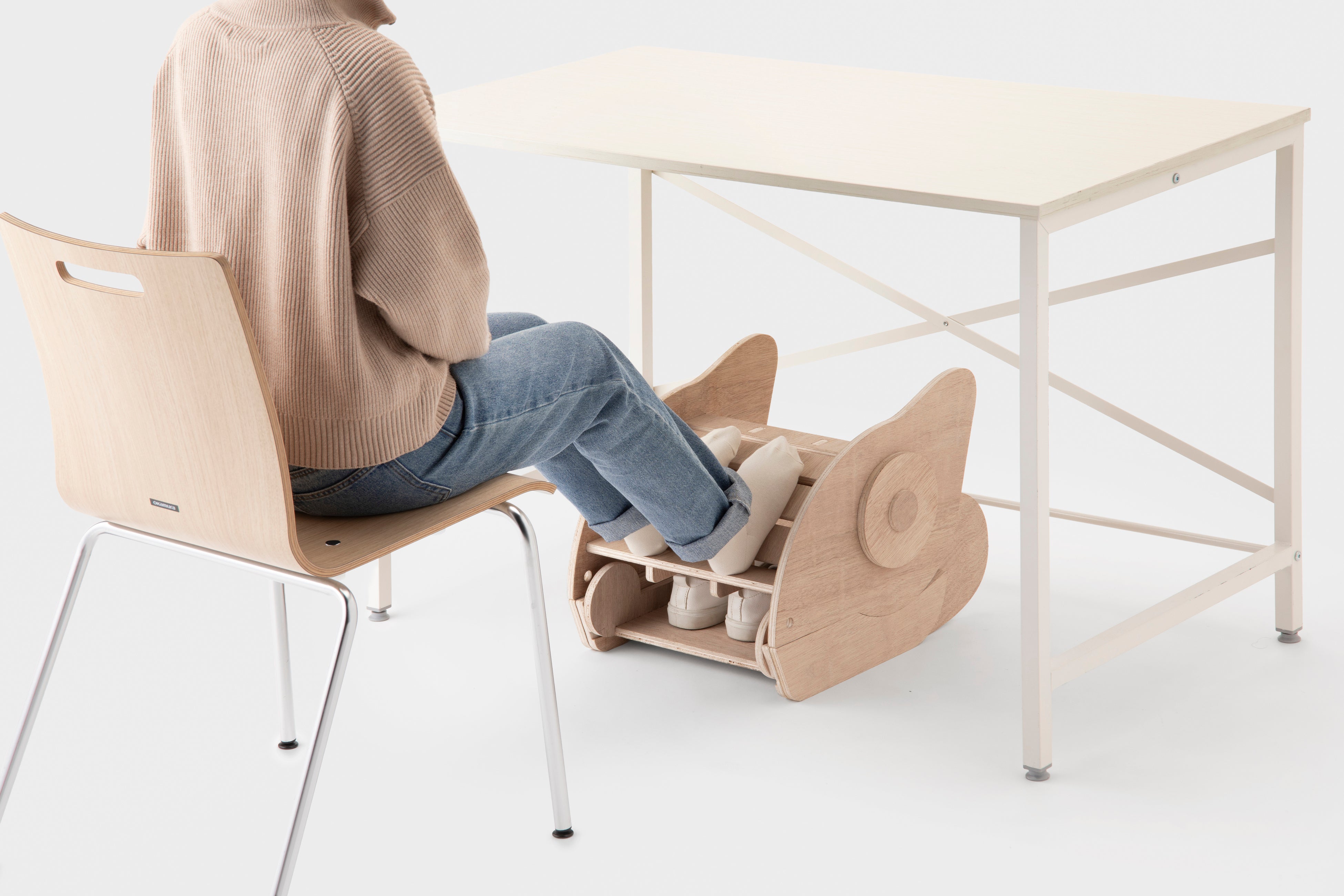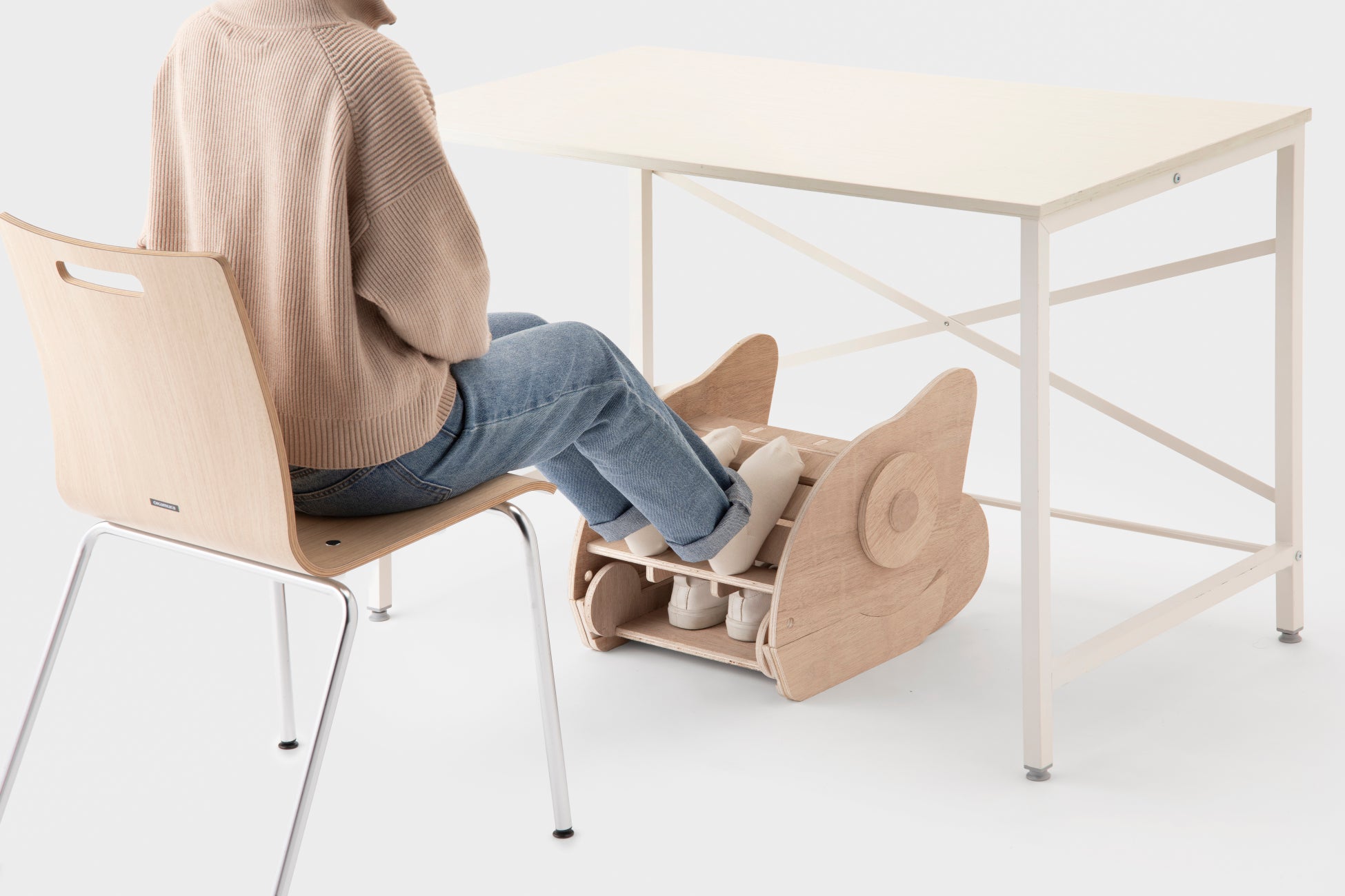 デスク下に潜むカメレスト。カメレオンをモチーフにした足置きは、疲れやすいデスクワークに安らぎをもたらします。舌の上に置いた靴は口の中に収納され、靴を脱いで足を置くまでの一連の動作は足先だけで完結。机の下にもぐって手を使う必要はなく、自然に行えます。オリジナルの配色で自由に彩ることで、自分色にカモフラージュするマイカメレストを作れます。みんなのことを支えるカメレオン達があなたの近くにも潜んでいるかも?