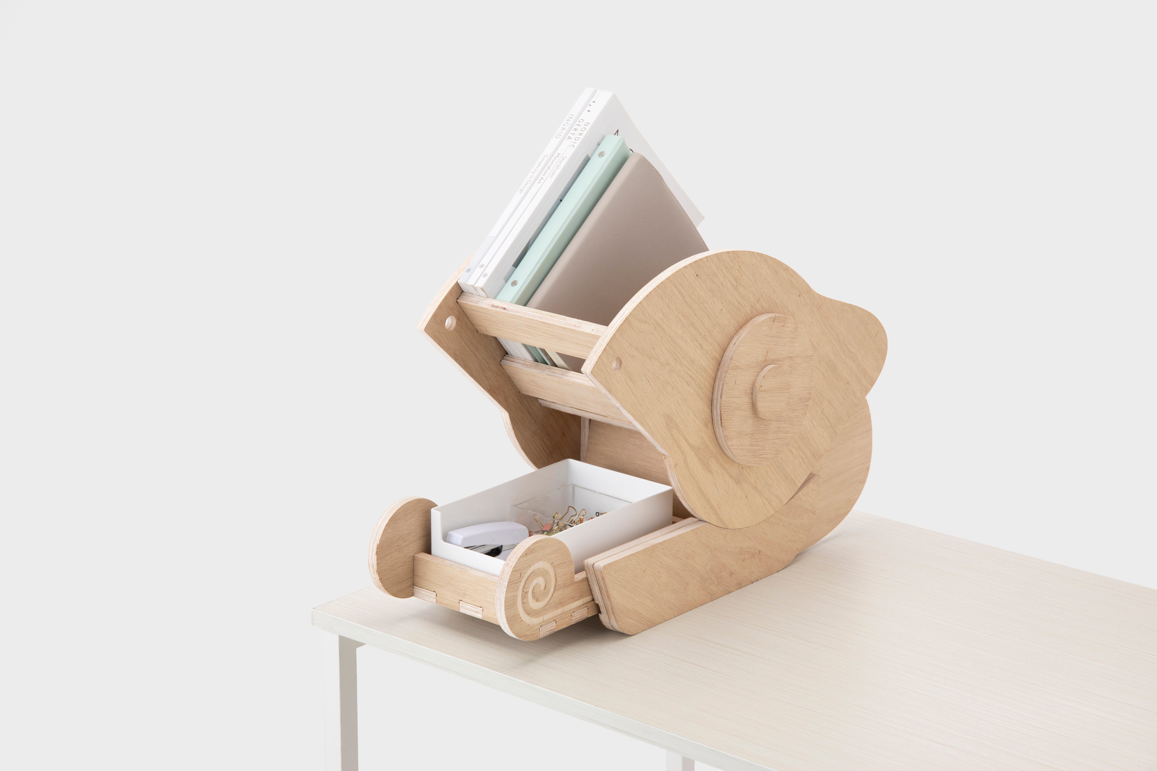 デスクに佇むハコレオン。カメレオンをモチーフにしたの文具入れは、散らかりがちなデスク周りをスッキリ片づけます。舌部分は文具入れになっており、口は舌と連動して開閉でき、小物の整理に便利。鼻部分にはA4サイズのバインダーを立てることも可能です。オリジナルの配色で自由に塗ることで、自分色に染まるマイハコレオンを作り上げられます。みんなのことを支えるカメレオン達があなたの近くにも潜んでいるかも?