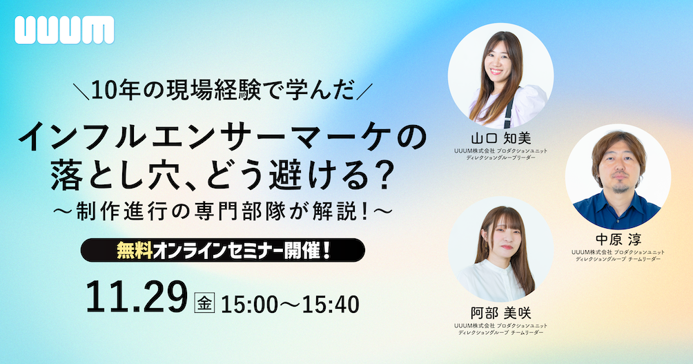 「10年の現場経験で学んだ インフルエンサーマーケの落とし穴、 どう避ける?〜制作進行の専門部隊が解説!〜」と題したオンラインセミナーを、2024年11月29日(金)15:00〜15:40に開催いたします。