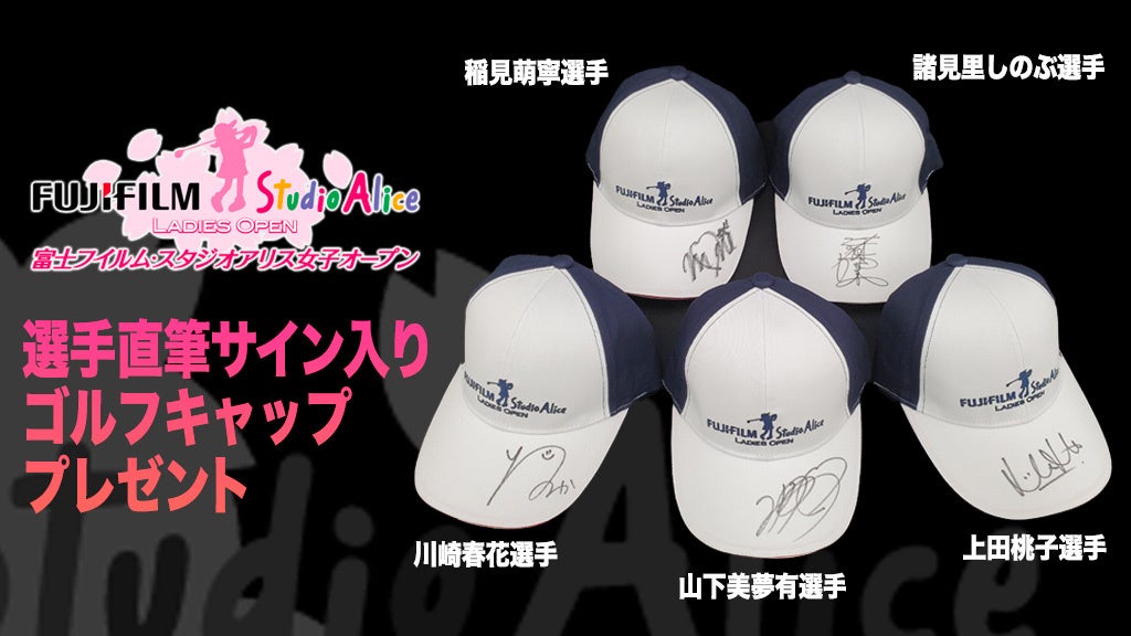 「富士フイルム・スタジオアリス女子オープン 2023」に出場した 上田桃子選手、山下美夢有選手、川崎春花選手、稲見萌寧選手、諸見里しのぶ選手 の直筆サイン入りキャップを日テレジータス視聴者の皆さまを対象に抽選でプレゼント!