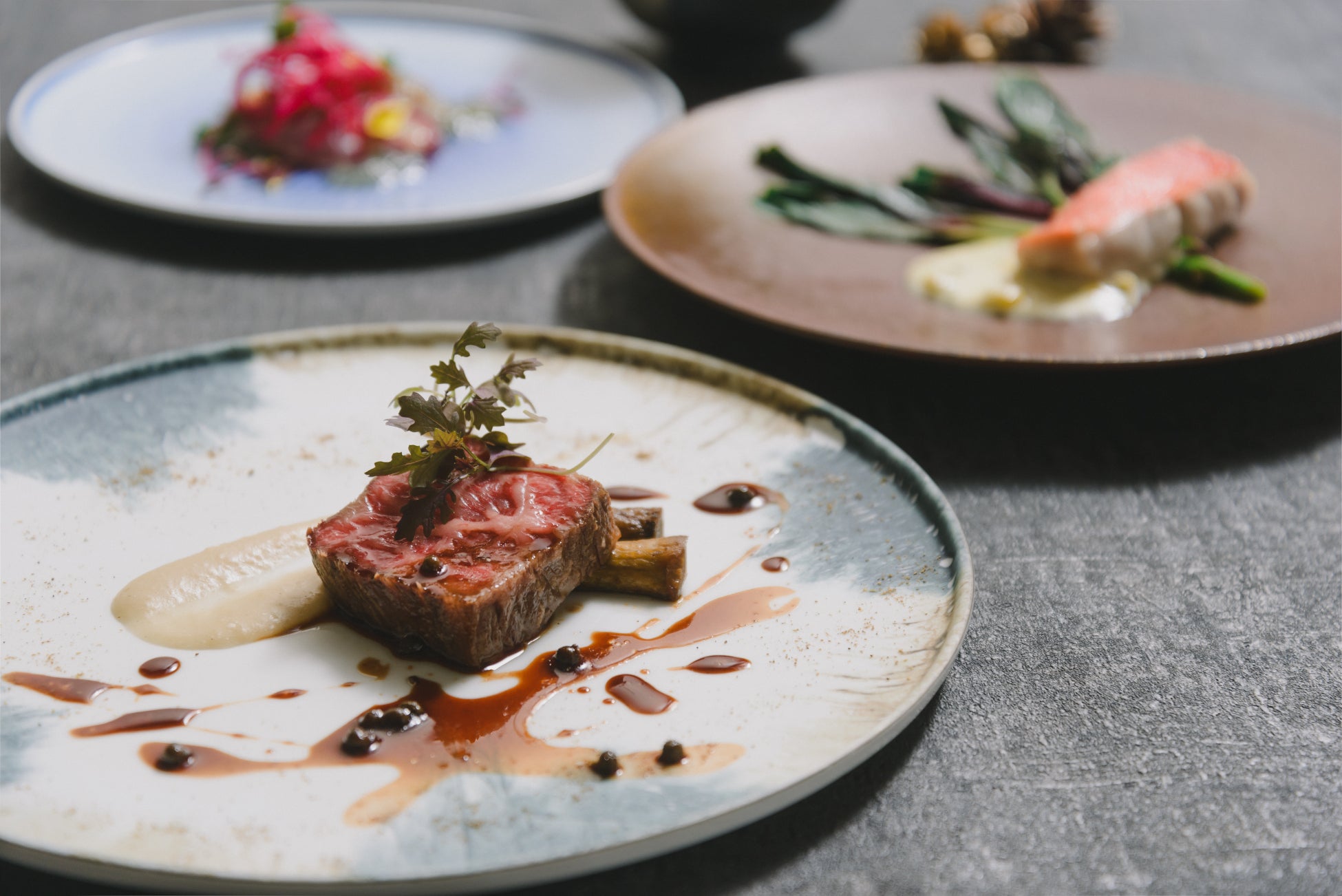 高宮庭園茶寮のレストランでご提供している料理は、九州の厳選された素材を用いて、日本ならではの出汁・茶などの食文化を大切にしながらも、様々な技法でアレンジをした創作料理「九州里山キュイジーヌ」です。
