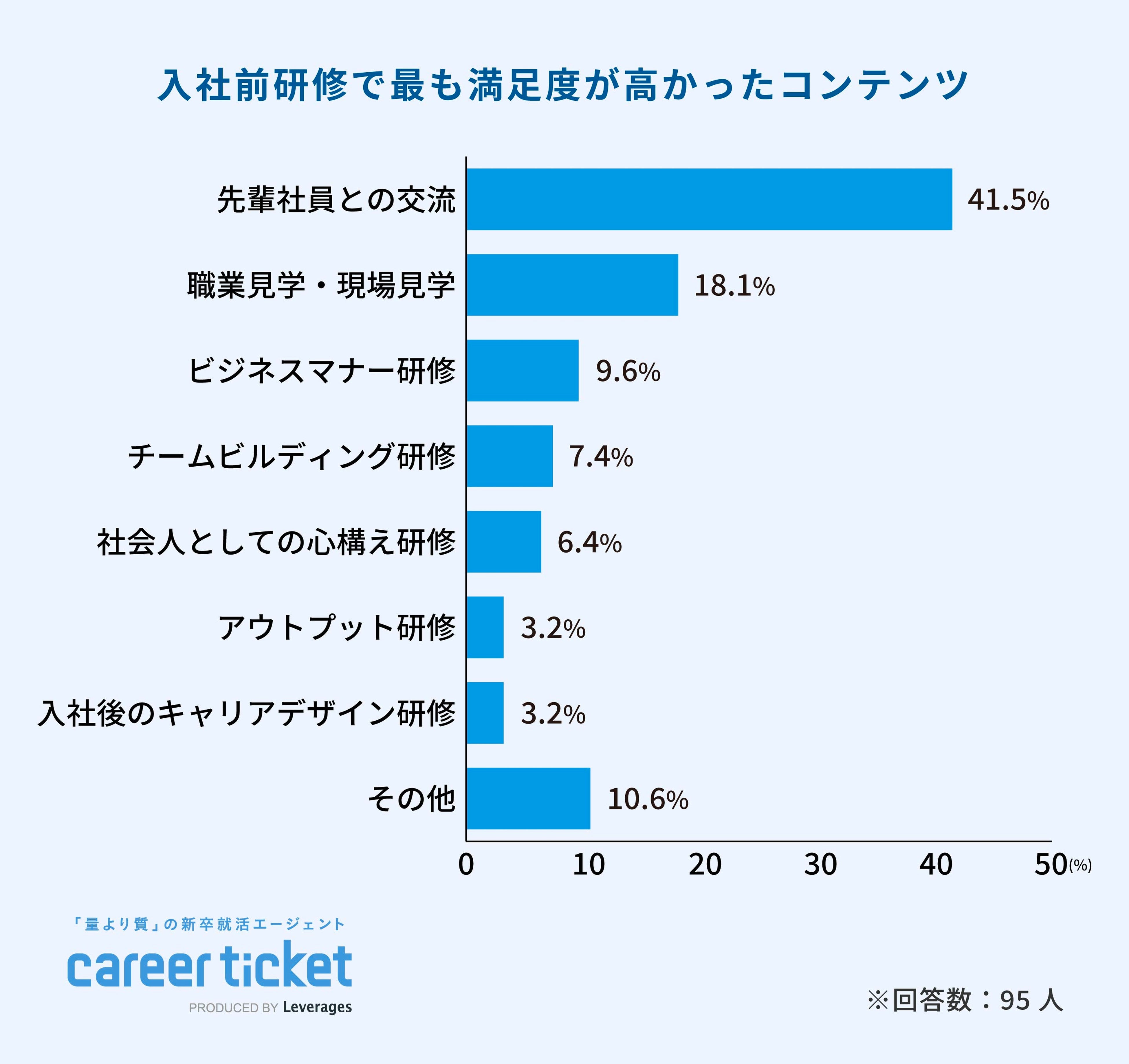 入社前研修でもっとも満足度が高かったコンテンツは、「先輩社員との交流(41.5%)」が1位となり、次いで「職業見学・現場見学(18.1%)」と続きます。 4月から一緒に働く社員や職場の雰囲気・仕事への理解が深まり働くイメージが鮮明になることが、入社意欲の向上に繋がっていると予想されます。