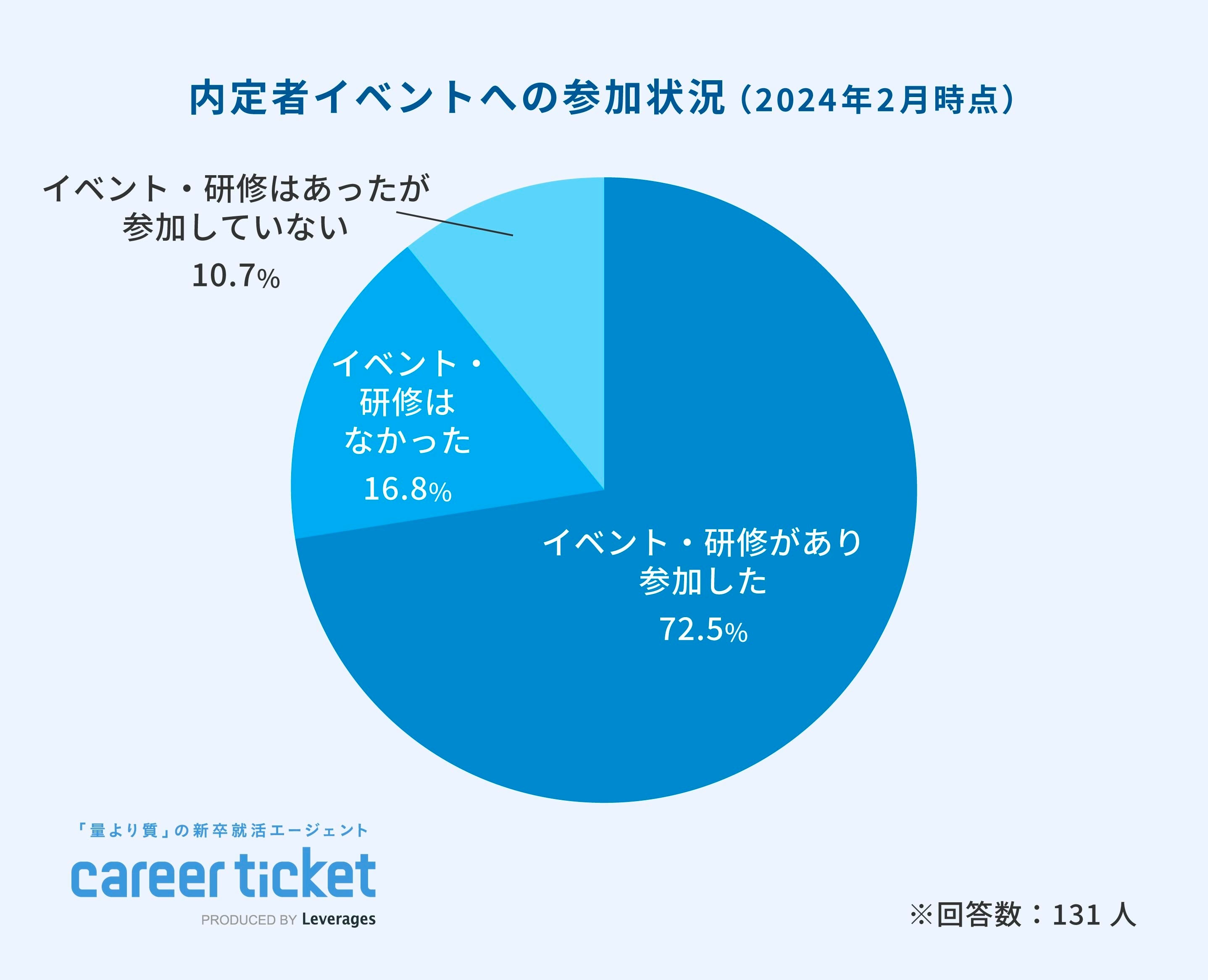 企業主催の内定者イベント(入社前研修や既存社員との交流など)への参加状況について聞いたところ、「イベント・研修があり参加した(72.5%)」が約7割と最も多く、次いで「イベント・研修はなかった(16.8%)」「イベント・研修はあったが参加していない(10.7%)」となりました。