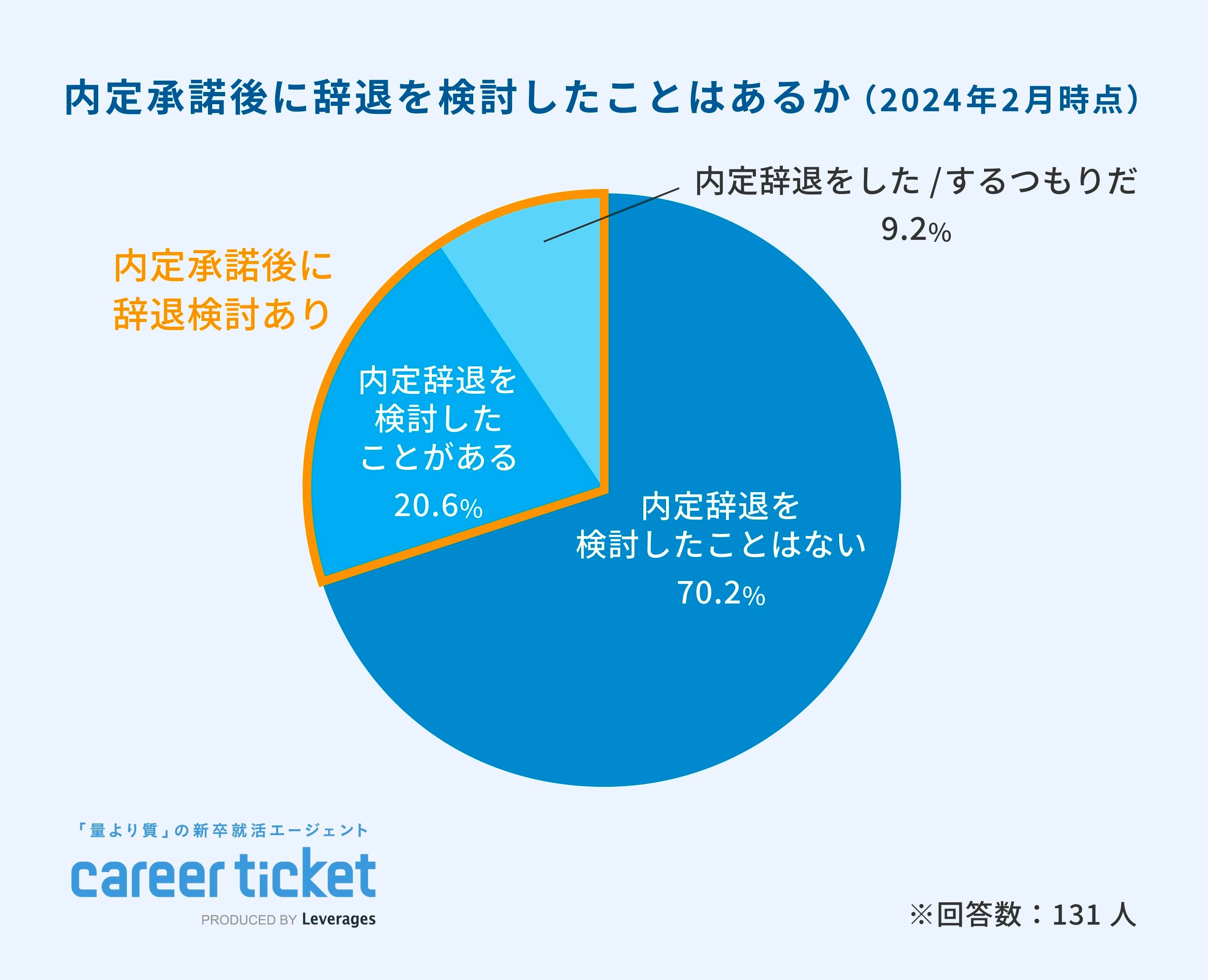 2024年卒業予定の大学生131名を対象に「内定承諾後に辞退を検討したことがあるか」と聞いたところ、「すでに辞退した・するつもりだ(9.2%)」「検討したことがある(20.6%)」の合わせて約3割が内定を承諾した後に辞退を検討していたことがわかりました。
