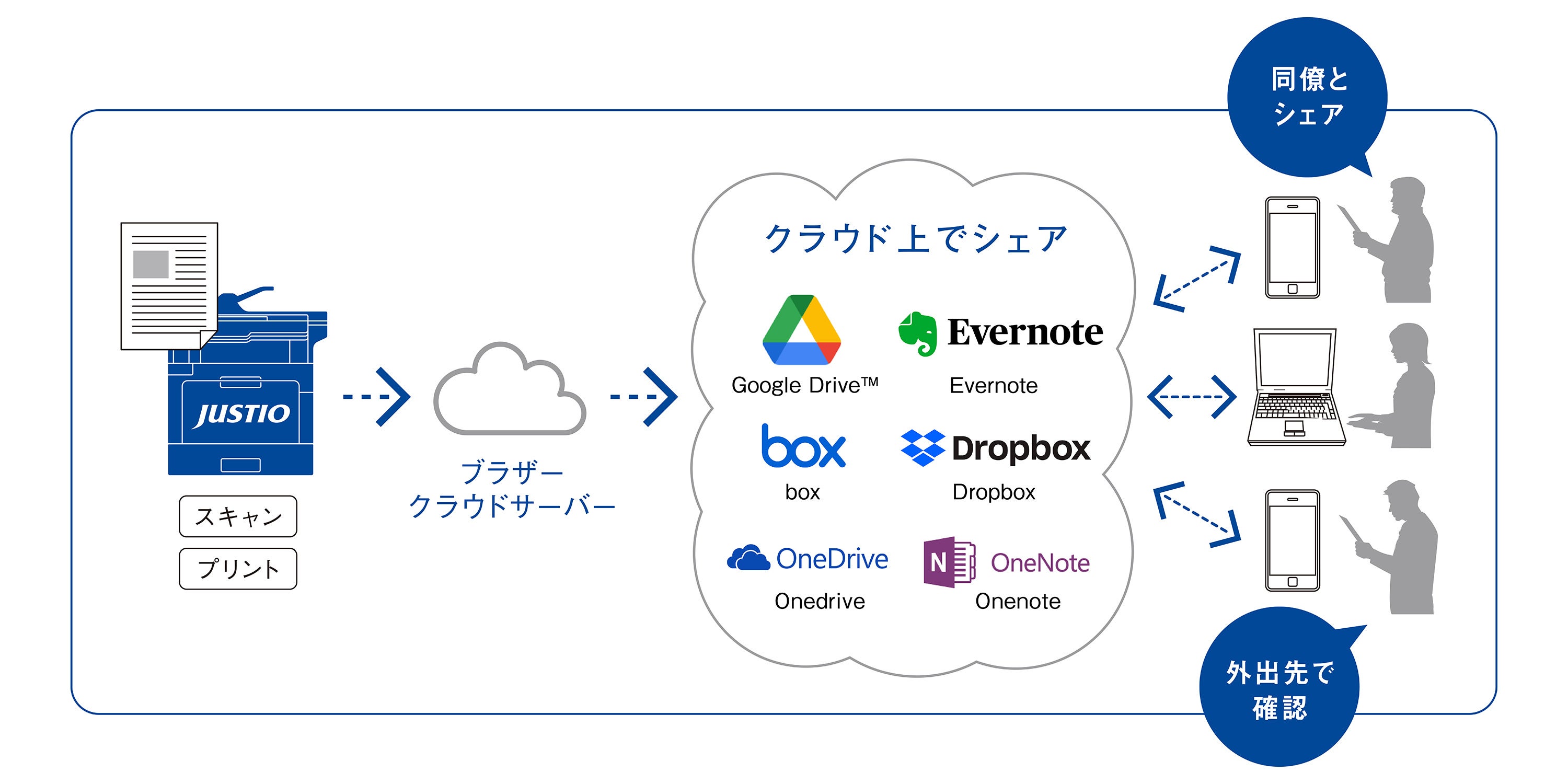 2.4GHz/5GHz対応の無線LANを搭載し、置き場所を問わずプリンターを共用できるスマートオフィスを実現する。ネットワークを利用して、スキャンしたデータや受信したFAXデータを、そのままパソコンを使わずに【※5】Google Driveやboxなどの各種ウェブサービスに保存して、外出先で確認することも可能だ。(HL-L2400Dは無線LAN非搭載)