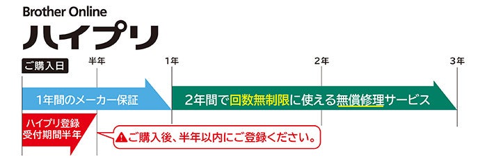 ブラザーオンライン「ハイプリ」に登録することで、1年間のメーカー保証に加えて、その後の2年間『無償修理サービス』【※6】を利用できる。保証内容を延長することができ、長く安心して使うことができる。(HL-L2400Dは「ハイプリ」非対応)