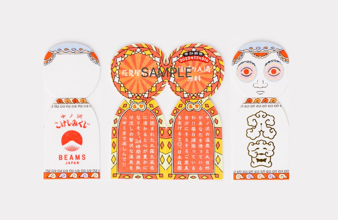 「中ノ沢こけしみくじ」は、上記期間中、BEAMS JAPAN(新宿)の店舗にて2寸の中ノ沢こけし(5種のうちいずれか)をご購入いただいた方が引くことのできるオリジナルおみくじです。全てのおみくじに中ノ沢温泉にちなんだ運気アップの方法が記載され、当たりくじでは中ノ沢温泉の日帰り入湯券や地元の菓子店の和菓子などの賞品が用意されます。