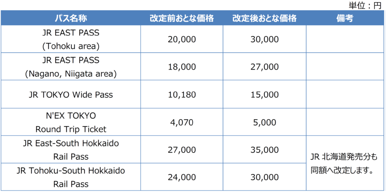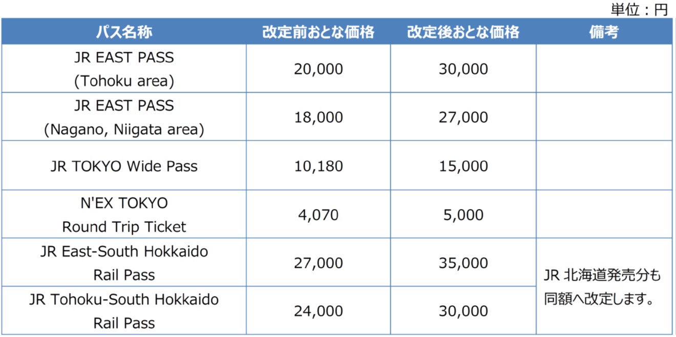 下表のとおり、鉄道パスの価格改定をします。(パス毎の詳細については別紙をご覧ください)