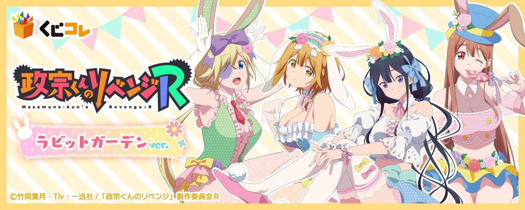 今回はTVアニメ『政宗くんのリベンジR』から【ラビットガーデン】をテーマに「安達垣 愛姫」、「小岩井 吉乃」、「藤ノ宮 寧子」、「ミュリエル・ベッソン」の新規描き下ろしイラストを使用した『くじコレ』でしか手に入らない商品をご用意いたしました!