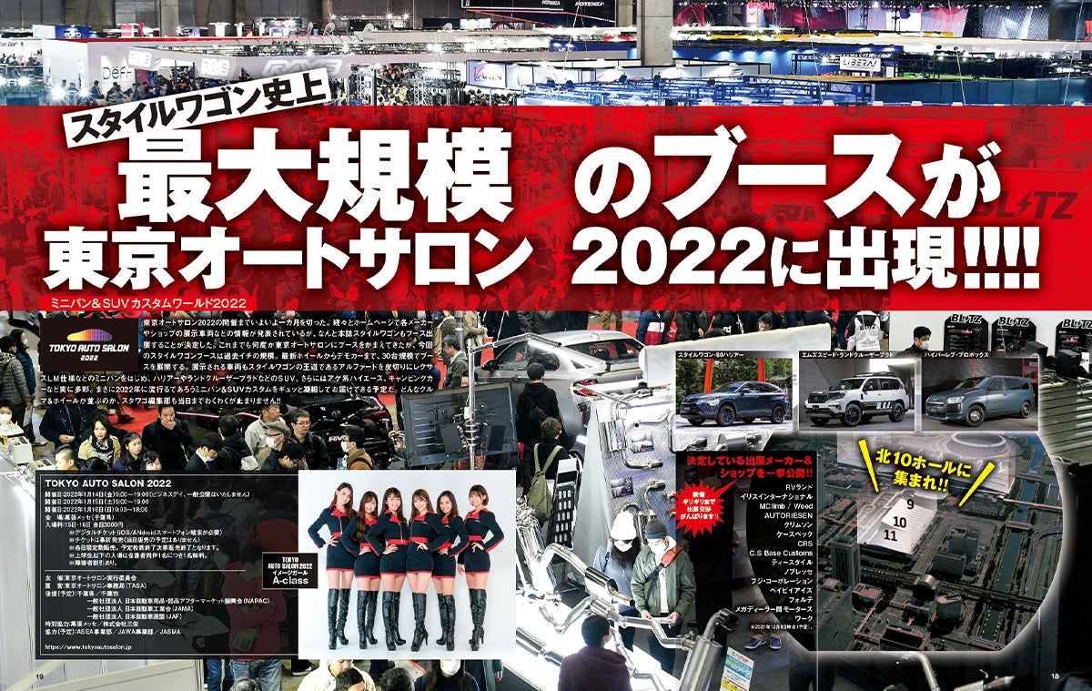 また、2022年1月14日(金)から16日(日)にかけて開催される東京オートサロン2022では、本誌過去最大規模のブースを展開します。ミニバンやSUVの最新カスタムが一堂に会するめったにない機会、ぜひ会場に遊びに来てくださいね♪
