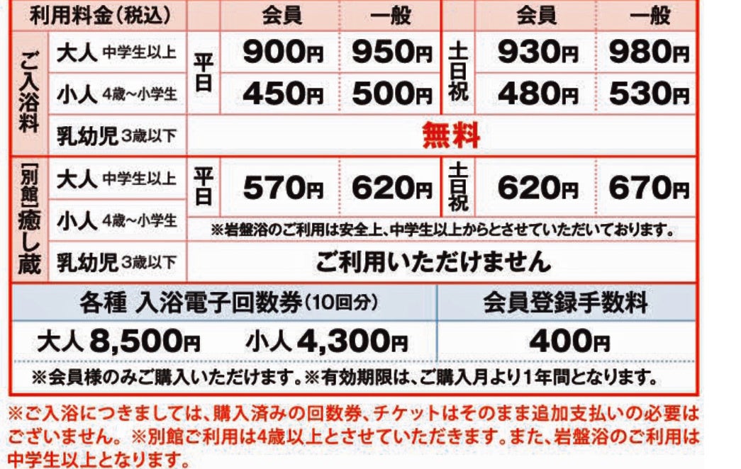キャンペーン第2弾 癒し蔵ご優待デー この日は、当日入浴+別館、癒し蔵利用が、会員1,200円、一般1,300円 ・毎週木曜日限定プランが、この週の平日はこの価格でご利用できます |