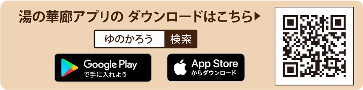 湯の華廊公式アプリにて、平日お使いいただけるお得なクーポンを配信しています。初回ダウンロードすると、湯の華廊オリジナルタオルがもらえます。この機会にぜひご登録をお願いします。