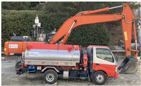 こうした状況を踏まえ、大林組では、CO2排出量の削減に向けた継続的な取り組みを前提としつつ、出光興産が建設業界などカーボンニュートラルへ挑戦する企業向けに供給をしているICOFJをはじめとしたカーボン・オフセットの活用について検討してきました。ICOFJには、J-クレジット制度に基づいて認証されたクレジットが付与されており、通常の燃料と同様に建設現場をはじめとするさまざまな場所で使用することが可能です。両社は、2024年から行っている次世代バイオ燃料「出光リニューアブルディーゼル(IRD)」の(※5)の実証において連携をしており、今回のICOFJ使用の取り組みは、この連携をさらに発展させたものです。