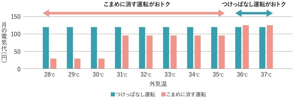 冷房使用時において、住宅の断熱性、室内熱負荷などの環境によるものの、外気温が35℃以上の“猛暑日”のような場合は、室温が上昇しやすいため、「つけっぱなし」運転がお得ですが、30℃程度までであれば、室内温度がそこまで上がらないため「こまめに消す」運転の方が電気代の節約につながることが分かりました。