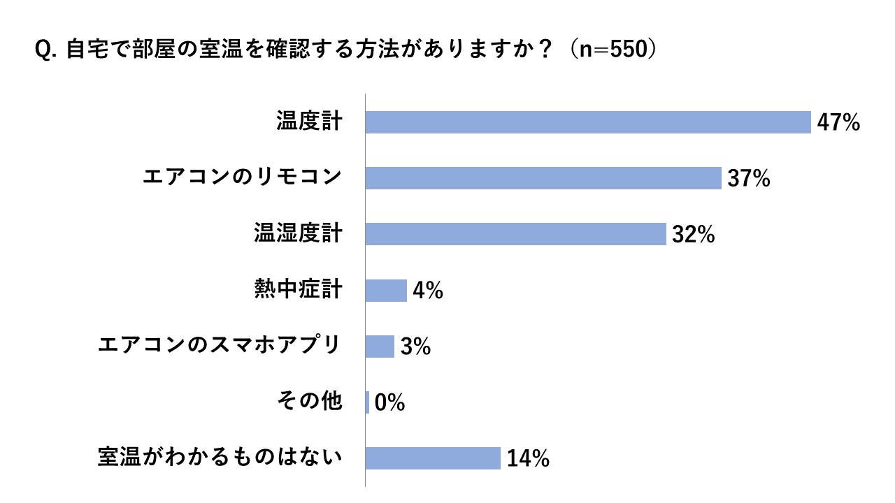 エアコンは室内機内部のセンサーで温度を測定しているため、設定温度と実際の室温が異なっているケースもあり、家の構造や日当たりなども影響してきます。中には、エアコンのお手入れ不足で能力が発揮できていないケースもあります。快適な空気環境を作るためにも、温度計などで室温を確認していただきながら室内温度を調整することが重要です。室内温度については、86%が自宅の室内温度を確認する方法がある一方で、14%は「ない」と回答しており、温度計をお持ちでない方は、この機会に実際の室内温度をチェックしてみるのも良いでしょう。