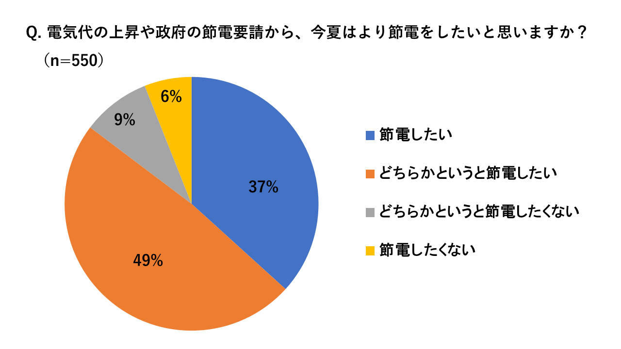 さらに、電気代の上昇や節電要請から、今夏はより節電を意識したいかをたずねたところ、86%が「節電したい」「どちらかというと節電したい」と回答し、高い節電意向が明らかになりました。