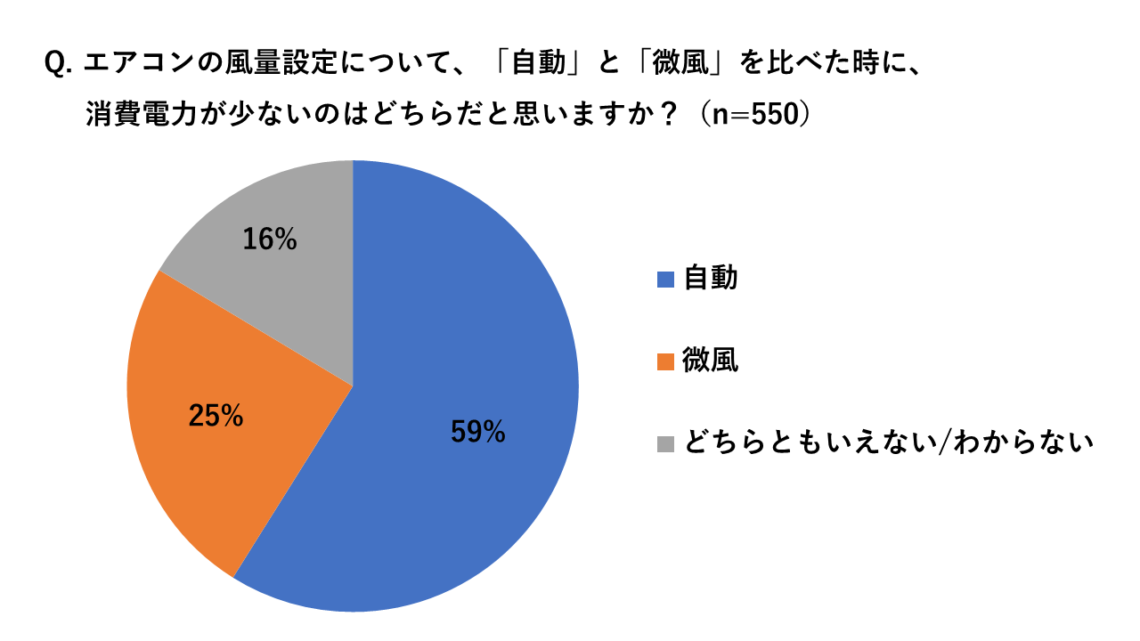 続いて、エアコンの風量設定について「自動」と「微風」を比べた時に、消費電力が少ないのはどちらだと思うかをたずねました。エアコンの風量設定は、環境にもよりますが、微風にすると設定温度に至るまで時間がかかり、逆に消費電力が増えてしまいます。しかし、正しく回答できたのは約6割で、4割が誤解をしていることが明らかになりました。