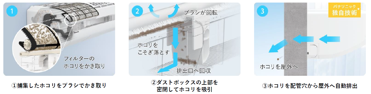 『エオリア』に搭載された“フィルターお掃除ロボット”は、累積24時間以上運転すると、自動で掃除を始めるという機能を持っています。フィルターが自ら動き、びっしりと配置されたブラシでクリーニングすることで、フィルターのホコリをしっかりとかき取り、キレイに取り除いてくれます。さらに、自動で捕集したホコリをブラシでかき取り、ダストボックスに入れ、配管穴から屋外へ自動で排出してくれる※ため、ホコリに直接触れることなく、フィルター掃除を完了させることができます。