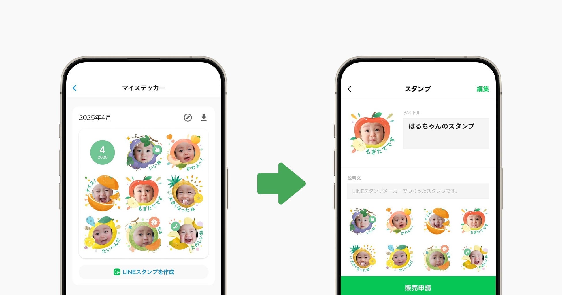 今回、みてね「ステッカープラン」と「LINEスタンプメーカー」が連携したことで、「みてね」内で自動提案されたステッカーデザインを、そのまま「LINEスタンプメーカー」に反映※することができます。これにより、利用者は「みてね」からステッカーをダウンロードする手間と、「LINEスタンプメーカー」で画像を個別に選択・アップロードする手間が不要になります。また、スタンプデザインにおいても、オリジナルデザインのステッカーがすでに作成されているため、個々のスタンプ用の画像編集やフレーム選択などの手間も軽減されます。