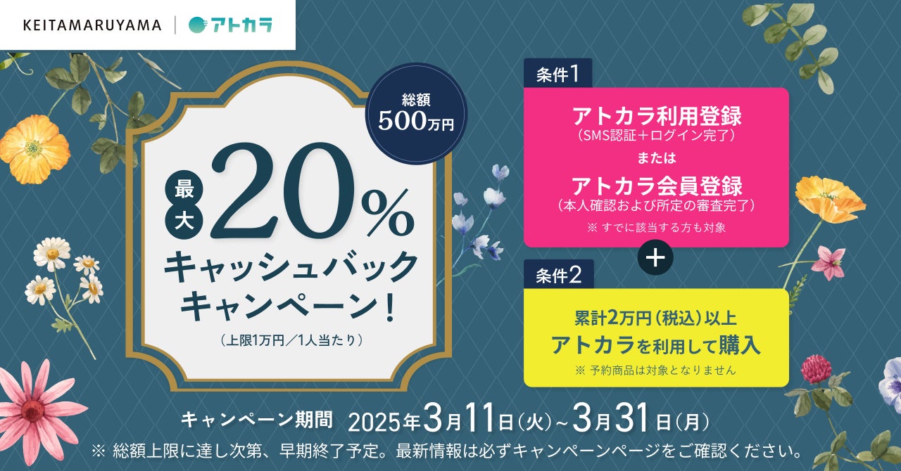 KEITAMARUYAMAでの「アトカラ」利用で条件を達成すると、もれなく20%キャッシュバックされるキャンペーンを期間限定で開催します。