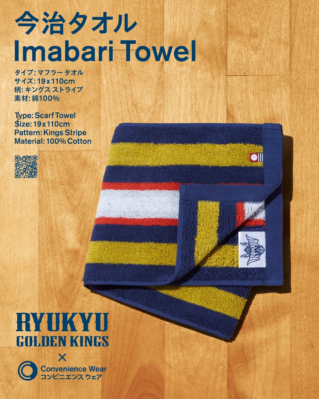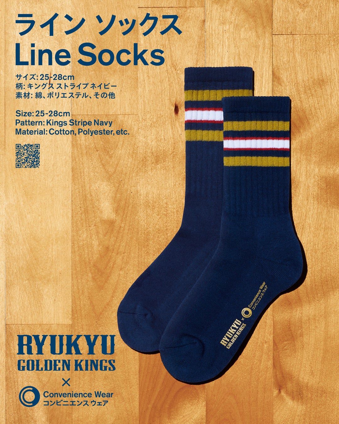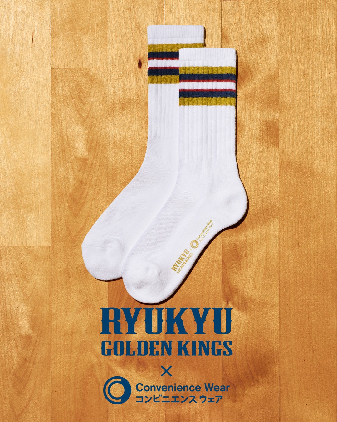 琉球ゴールデンキングスとのコラボでは、「ラインソックス」、「ハンドタオル」、「マフラータオル」の3種を販売いたします。