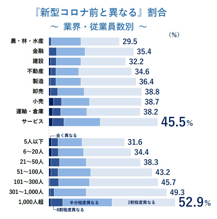 また、「2割程度異なる」(22.5%)も含めた『新型コロナ前と異なる』とする企業は38.0%となった。