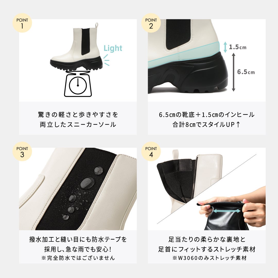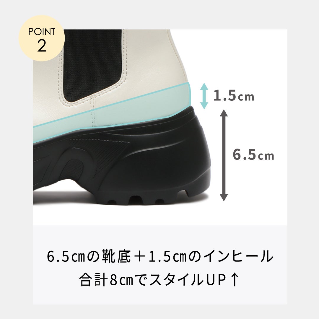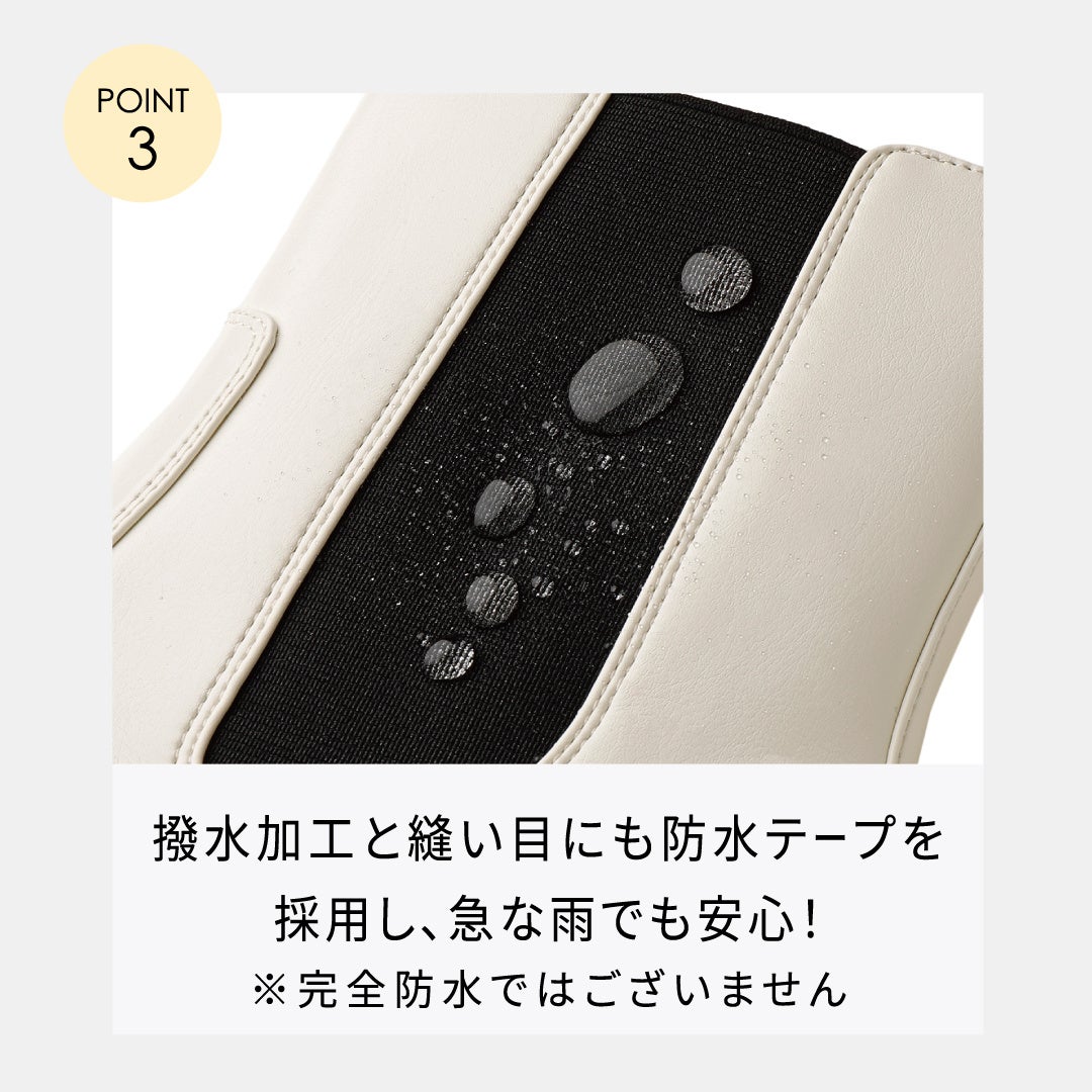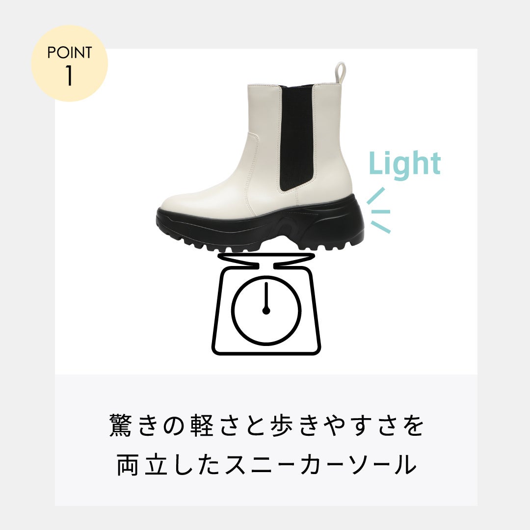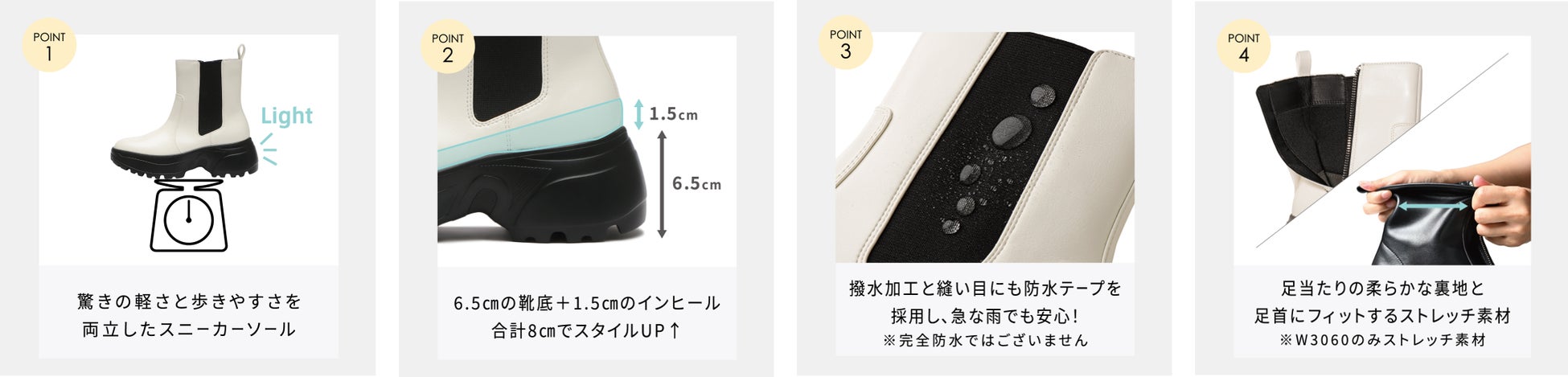今回展開される2型の「ラク軽ブーツ」では、6.5cmの厚底+1.5cmインヒールでスタイルアップを叶え、スニーカーソールであるため軽やかな履き心地を実現します。また、アッパーには撥水加工が施されており雨や雪の日でも心強い相棒ブーツです。