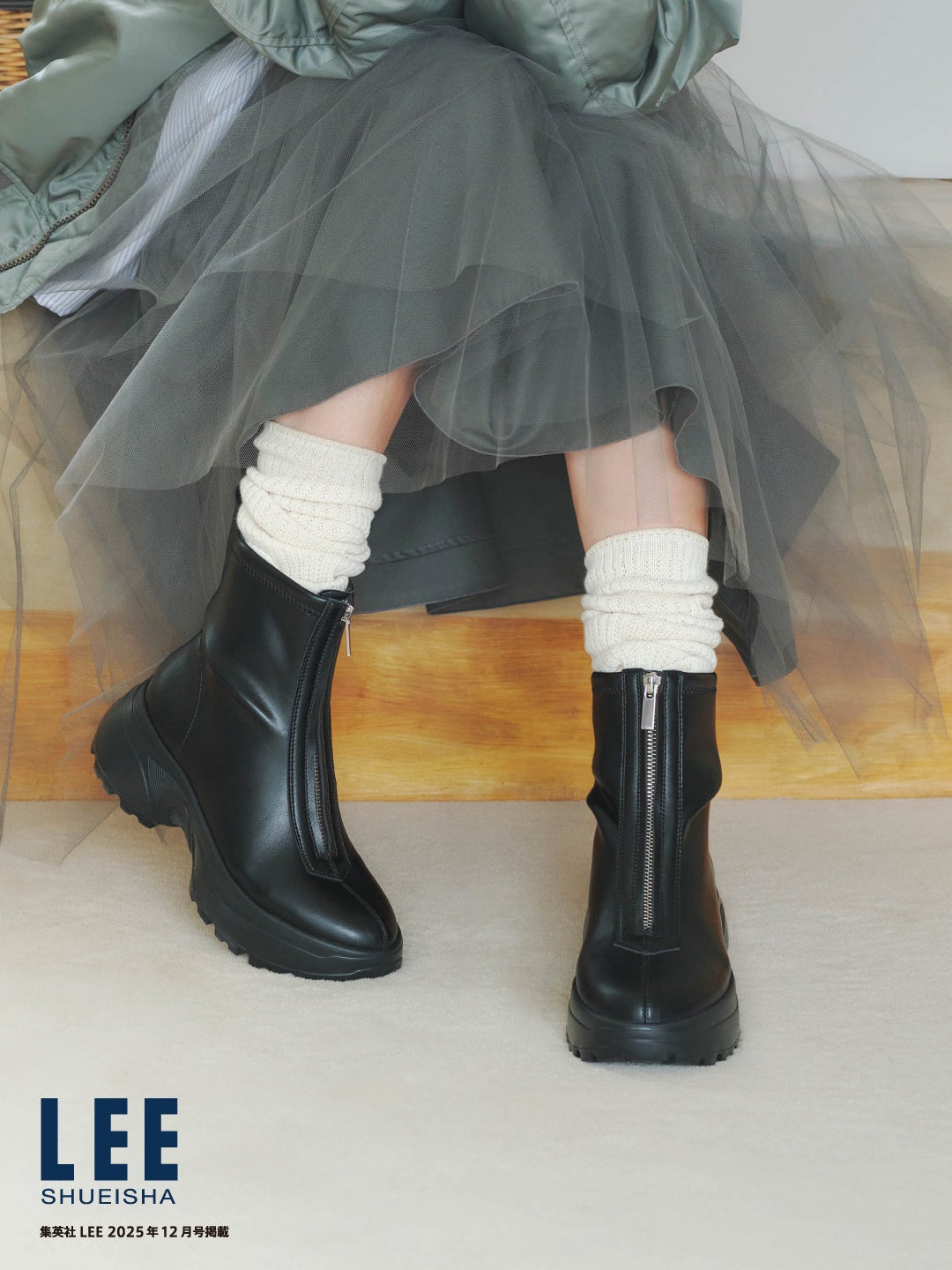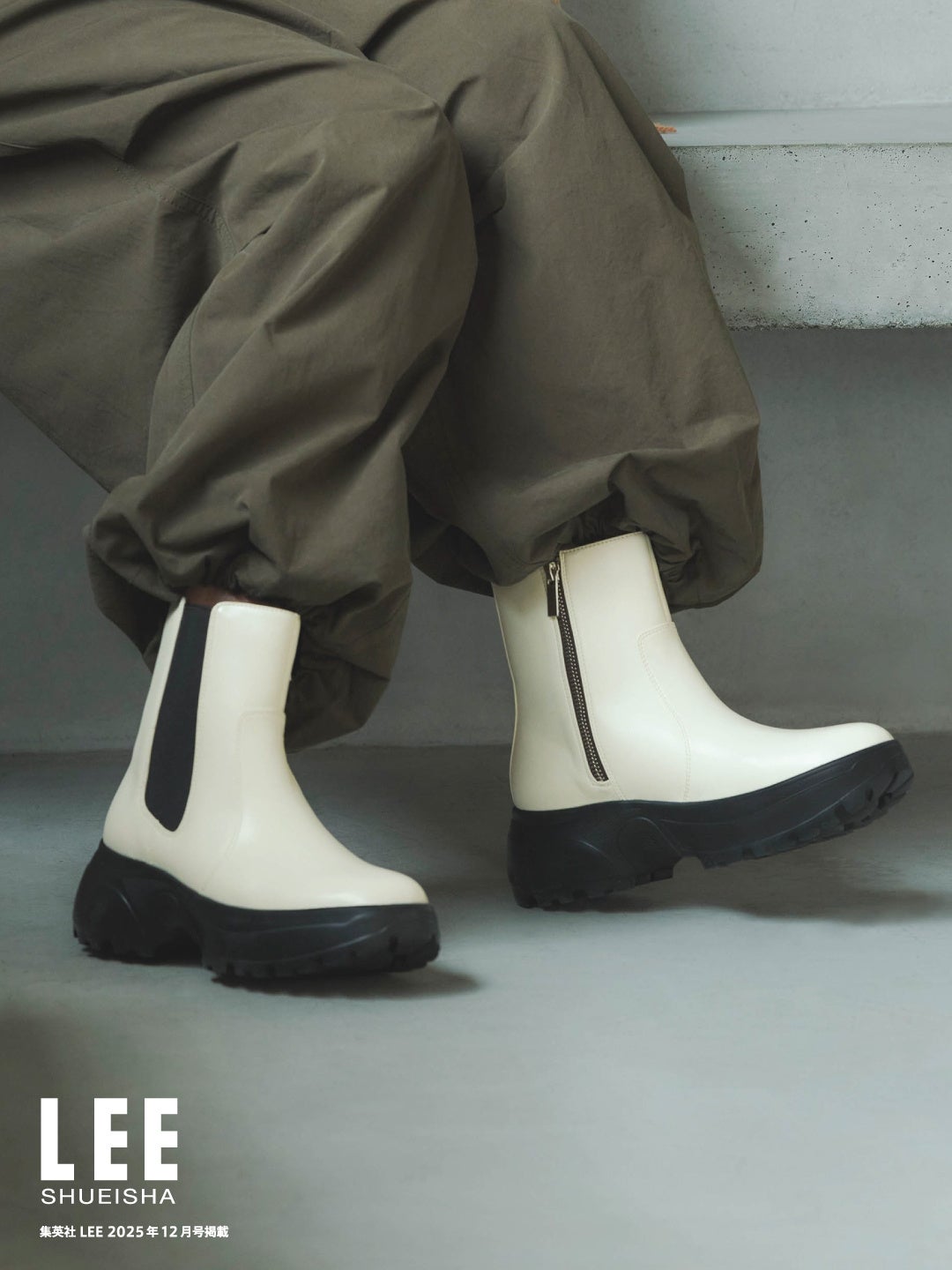 コラボ企画第2弾となる今回は、第1弾に続き『LEE』が大切にする“読者の声”に耳を傾け、スタイリストとして活躍する高橋さんが「こんなのが欲しかった」という思いを形にした、スニーカー感覚で履ける快適な履き心地のブーツシリーズです。昨今ブーツトレンドの中でも注目を集める「フロントジップ」タイプと、王道のBLACKと抜け感満点のWHITEのカラー展開「サイドゴア」タイプの2型を取り揃えております。