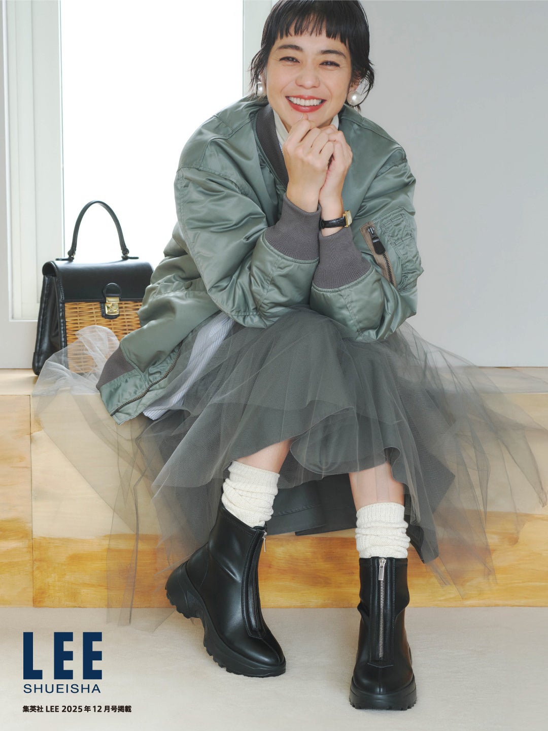 ビジュアルでは、モデルの竹下さんが本製品を主役にした秋冬スタイリングを披露。MA-1ブルゾンにチュールスカートを合わせた甘辛MIXコーデや、ブレザーにパンツを合わせた王道のトラッドコーデなど幅広いコーディネートを提案します。シーンやスタイリングを問わず取り入れやすい万能なブーツとして、その魅力を表現しています。
