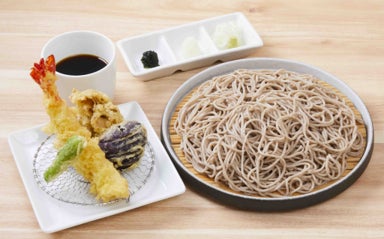 大ぶりの海老と新鮮野菜をゴマ油の風味をきかせてカラッと揚げた天ぷらと、風味豊かな二八蕎麦を、「揚げたて」「茹でたて」でご提供いたします。また、3種(ネギ、おろし、のり)の薬味は、さらに蕎麦の愉しみを広げます。