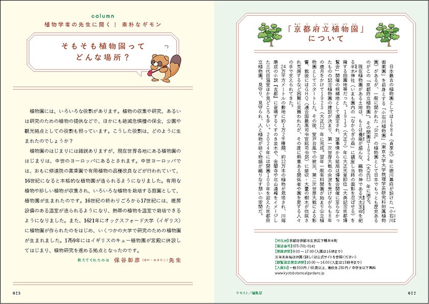 Column そもそも植物園ってどんな場所?/どうしてハスの葉は水をはじくの?/暖かい地域の花の色ってなぜ鮮やかなものが多いの?/ 絶滅危惧種はどうやって決める?/新種の発見ってどうやって行われる?/ 花みたいだけれど花じゃない?/花の匂いってなんのためにあるの?/野草と雑草って同じもの?違うもの?