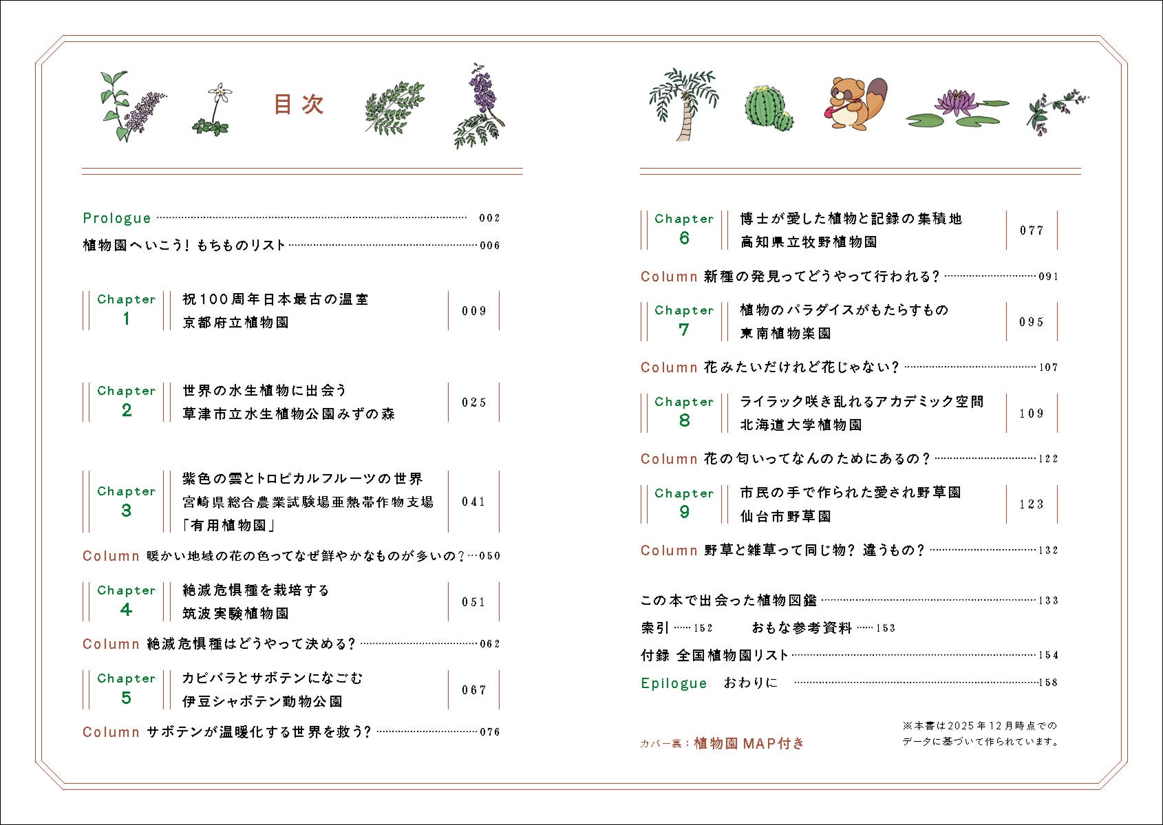 「ただ歩くだけ」だった植物園が、背景や意味を知ることで、また違った視点で学べる場所へと変わっていきます。巻末には、100種以上の植物を収録した植物図鑑を掲載。さらに、全国各地のおすすめ植物園をまとめたMAPも付属しており、実際の来園や旅の計画にも役立つ内容となっています。