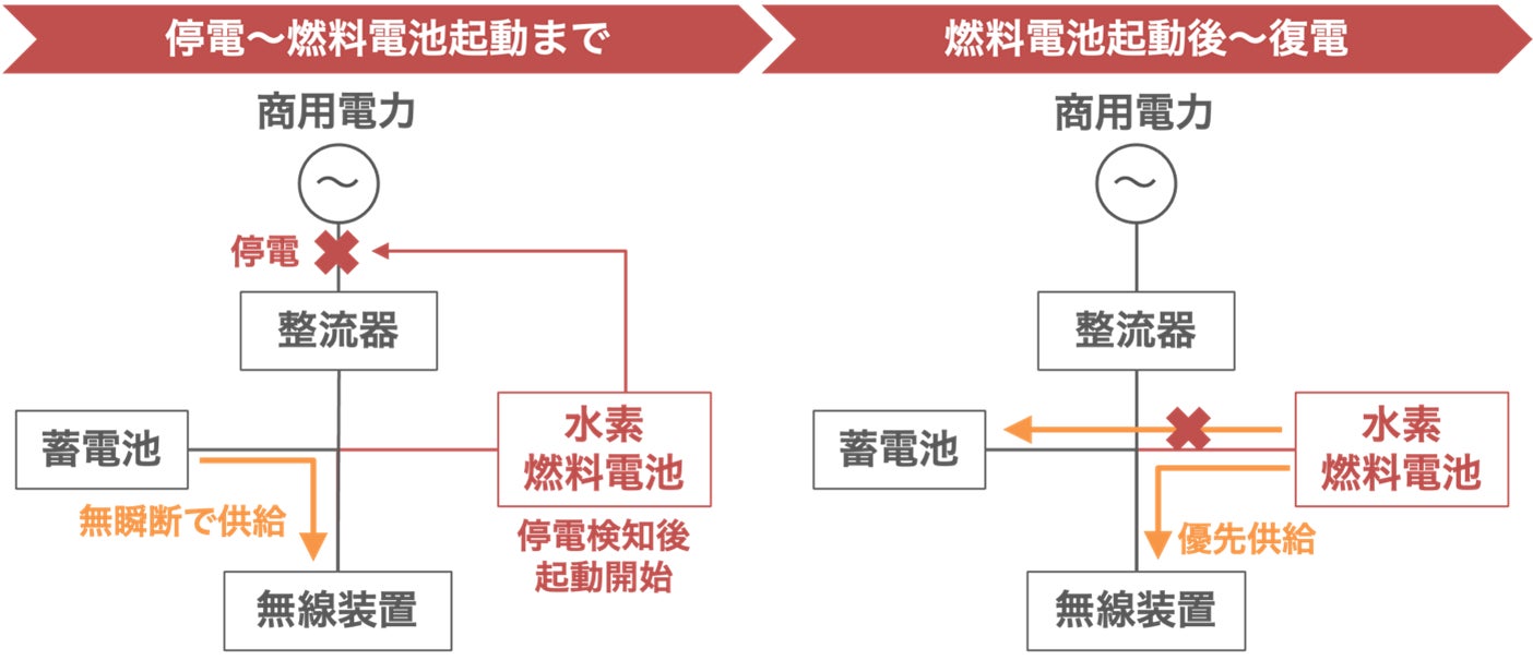 水素燃料電池から蓄電池に充電された電力を無線装置に供給することは可能だが、蓄電池への