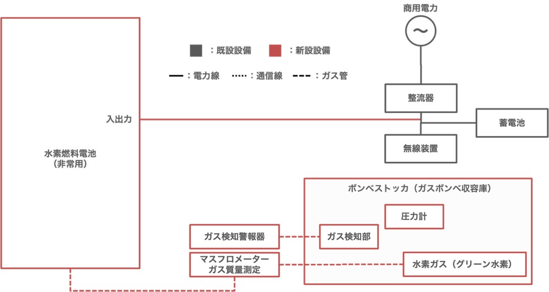 目的とし、水素燃料電池が基地局の非常用電源として適用可能か検証する。