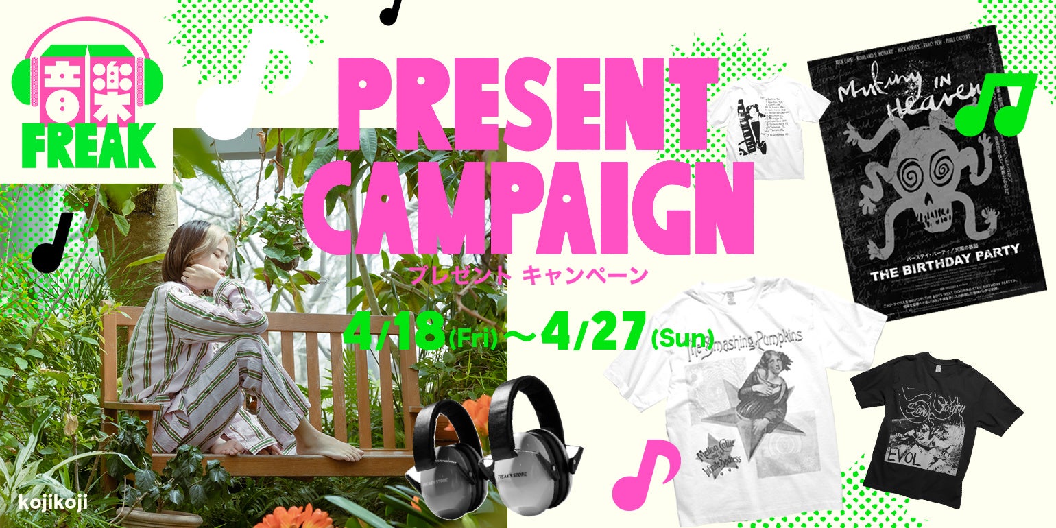 フリークス ストアが考える音の楽しみ方『音楽 FREAK』1周年を記念したキャンペーンを開催します。SNSフォロー&コメントで、kojikoji のサイン入りイヤマフとロックとアートを纏うバンT3種、70年代バンドの軌跡ドキュメンタリー映画『バースデイ・パーティ/天国の暴動』のペアチケットを合計10名様に抽選でプレゼントします。