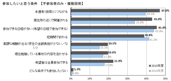 インターンシップに参加する目的について聞くと、「志望企業や志望業界で働くことを経験するため(44.8%)」が最も多く、前年トップだった「自分が何をやりたいのかを見つけるため(44.7%)」を僅差で上回った。前年比で見ると「特定の企業のことを良く知るため(43.1%:前年比7.5pt増)」、「就職活動に有利だと考えたため(21.0%:前年比4.6pt増)」の項目が明確に増加した。さらに、これまでにインターンシップに参加したことがない学生にどのような条件であれば参加したいかを聞いたところ、前年と順位が大きく変わり、「本選考(採用)につながる」が前年比7.5pt増の47.0%と約半数になった。学生が前年より一層、就職を強く意識してインターンシップに取り組んでいることが分かる。
