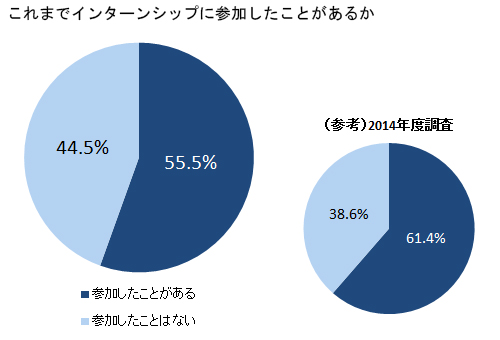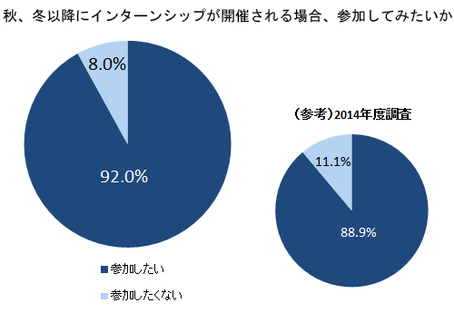 調査回答時(9月30日~10月15日)までにインターンシップに参加したことのある学生は、前年比5.9pt減の55.5% と減少した。後ろ倒しとなった2016年卒採用の選考期間と重なったことで、夏のインターンシップ開催数が減少したことが要因として考えられる。一方、秋・冬以降実施のインターンシップの参加については、「参加したい」との回答が92.0%と、前年比で3.1pt増加した。