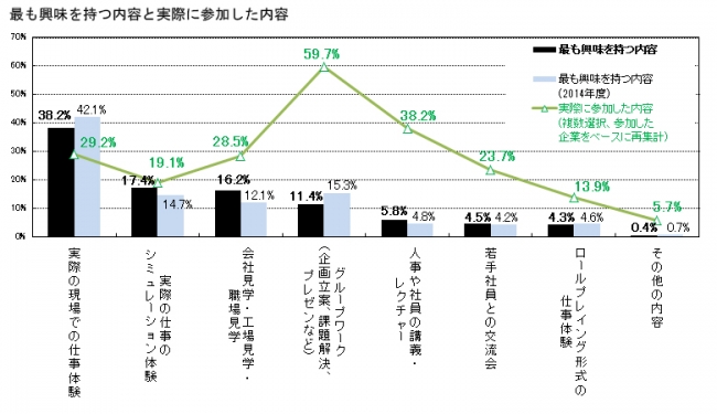 ■ 学生が最も興味のある内容は「実際の現場での仕事体験」だが、実際に参加した内容は「グループワーク」が最多。学生の希望とのギャップが目立つ結果に