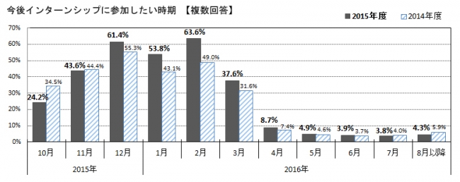今後インターンシップに参加したい時期について聞くと、12月、1月、2月と答えた学生がそれぞれ半数を超え、冬のインターンシップに学生の注目が集まっている。前年は、12月が最も多く選択されたが、今回は僅差ながら2月が最多となった。秋・冬のインターンシップが前年より浸透し、中でも採用広報開始直前の2月の人気が高まっているようだ。