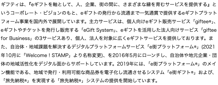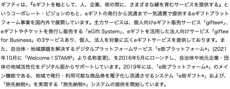 ギフティは、引き続き、地域経済活性化の手段として、全国の自治体および地域に根ざした事業会社への「e街プラットフォーム®」の提供を一層推進します。また、ギフトで「人とまち」をつなぐというミッションのもと、「e街プラットフォーム®」の普及を通じて、地域活性化および新たな体験の創出に貢献してまいります。