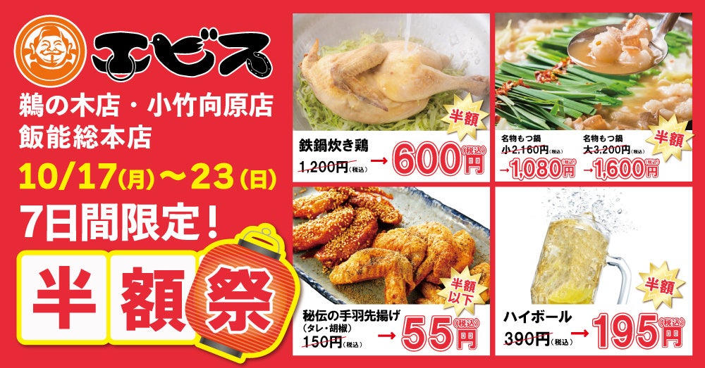 日頃のご愛顧に感謝の気持ちを込めて、2022年10月17日(月)~23日(日)の7日間は「エビス」の名物メニューが半額に!さらに半額以下になる超お得メニューもご用意しました。