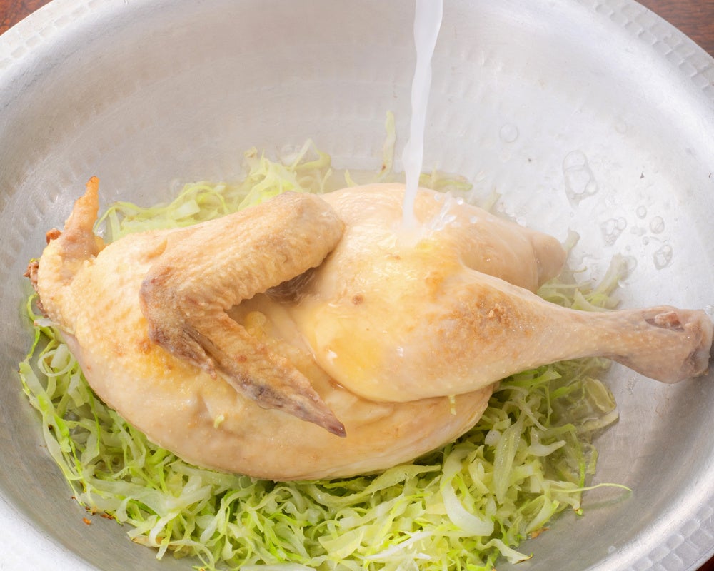 柔らかーく炊いたひな鳥の半身を、たっぷり敷いたキャベツの千切りの上に乗せて、濃厚な鶏がらスープをかけて、お客様の目の前で仕上げる、エビスの新名物!当店オリジナルの酢醤油と薬味でお召し上がりください。