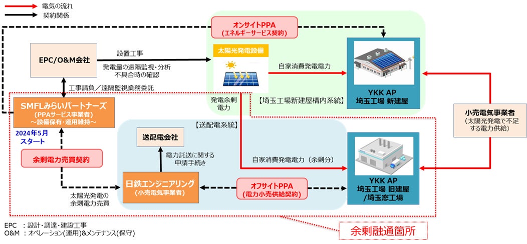 YKK AP株式会社(代表取締役社長:魚津 彰)、日鉄エンジニアリング株式会社(代表取締役社長:石倭 行人)、三井住友ファイナンス&リース株式会社(代表取締役社長:橘 正喜)の戦略子会社、SMFLみらいパートナーズ株式会社(代表取締役社長:上田 明)の3社は、オンサイト型太陽光発電エネルギーサービス(以下「オンサイトPPA(※1)」)の新たなスキームとなる「発電余剰電力融通型オンサイトPPA」の運用を2024年5月に開始し、埼玉県美里町のYKK AP埼玉工場新建屋で発電される再エネ電力を、YKK APの別の2施設(埼玉工場旧建屋および、埼玉県久喜市の埼玉窓工場)へも託送供給することで、埼玉工場新建屋に設置された太陽光発電設備から供給される再エネ電力を100%有効活用する体制を整えました。