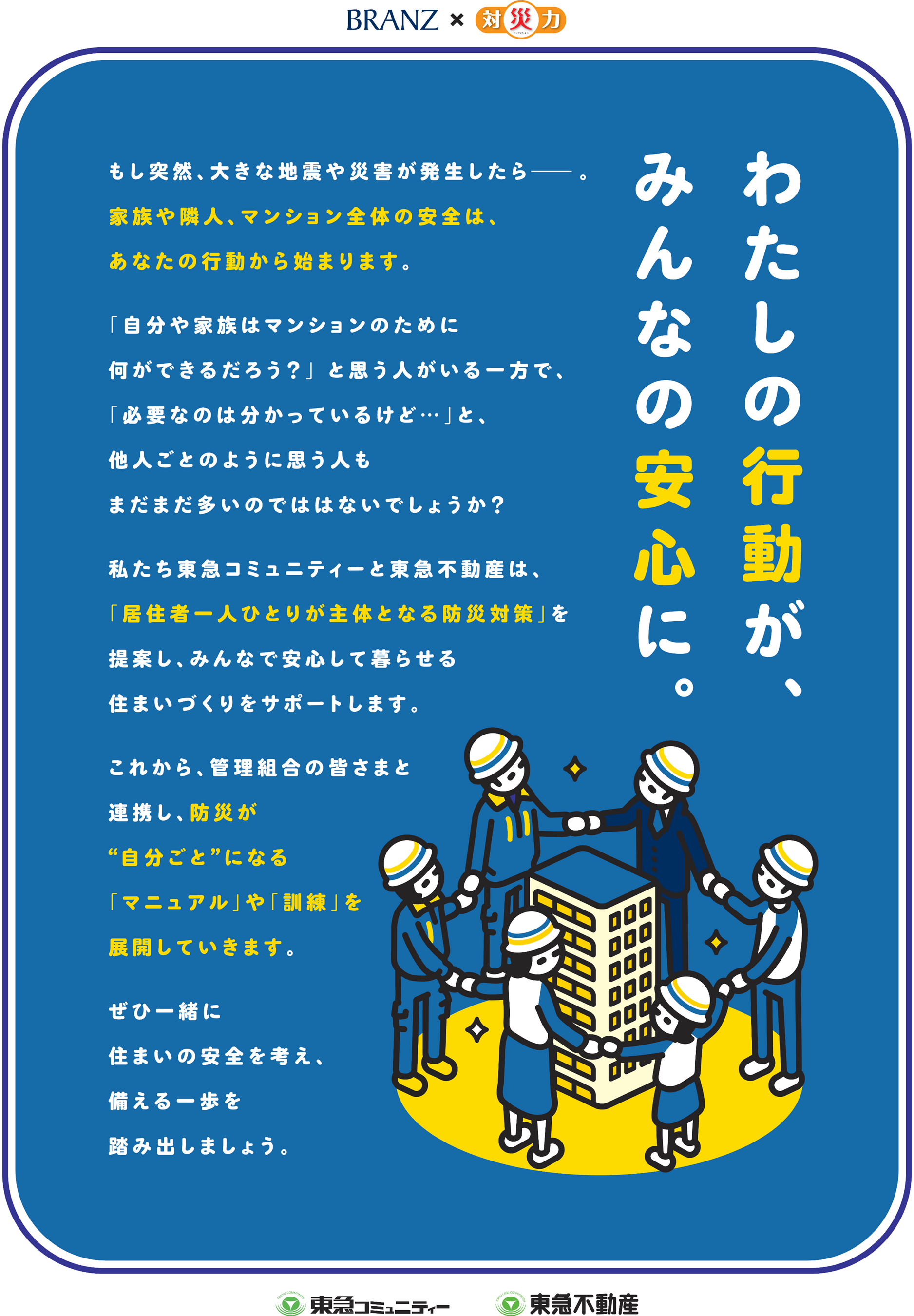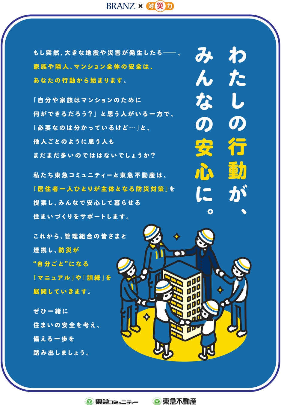 東急不動産×東急コミュニティー、分譲マンション「BRANZ」の新防災基準を策定 ハード・ソフト両面から、自助・共助をサポートする「BRANZ×対災力」新築標準化・既分譲物件へも順次拡大