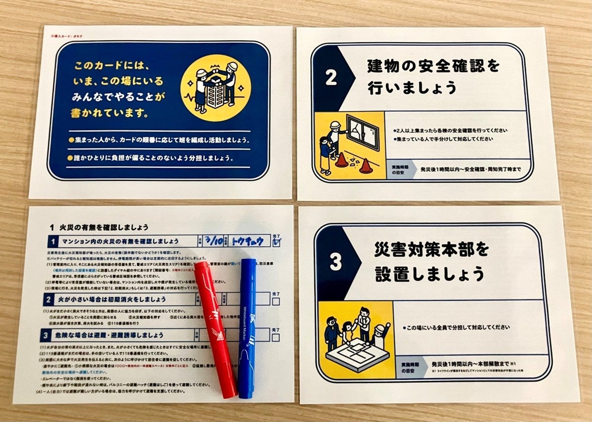 発災直後の混乱期から災害の収束までの期間に渡って、在宅している住民だけでも共助活動ができるように、初動アクションと生活支援アクションに優先順位をつけカード化した「災害時まずはここからBOX」を全物件の共用部分に設置します。最大の特徴は、災害時に必要な役割を特定の方に固定せず、その場にいる居住者で役割分担し進める前提とするため、初見でもわかるよう共助活動をミッションカード化し、さらに、アクションに必要な書類や防災備品について、カード順に合わせてすぐに使えるようわかりやすく整理をおこなう点です。また、本カードの導入は防災訓練の質も大きく向上させます。従来の「備品を確認するだけ」の訓練から、住民同士が役割を分担し、実際に動ける「実践型パッケージ」へと昇華させることで、管理組合の運営力とコミュニティの共助意識を劇的に高めます。