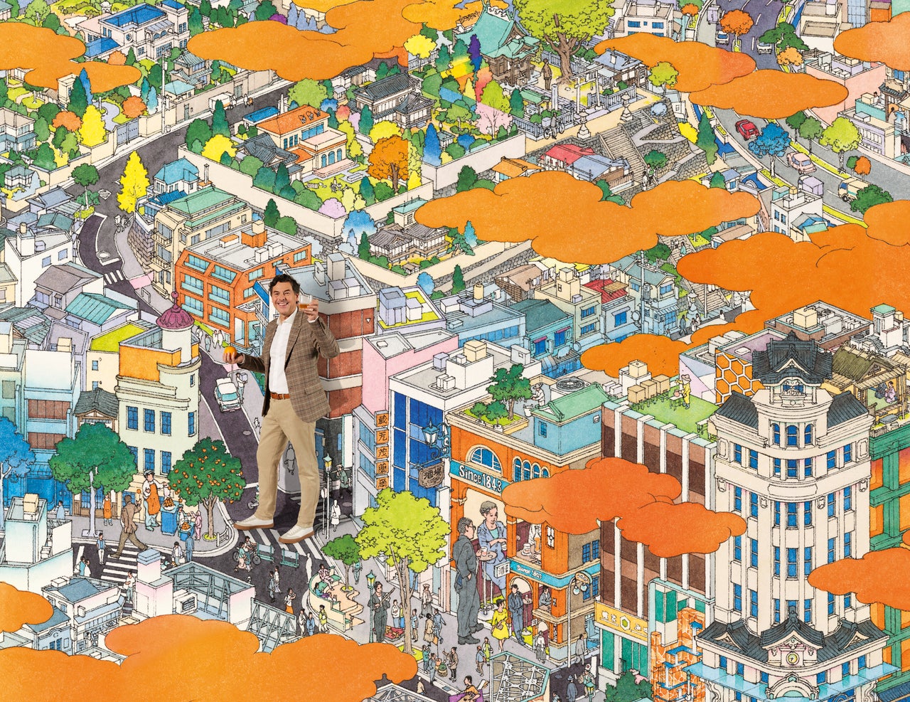 この鮮やかなアートワークは、遊び心に溢れています。東京を舞台に、様々な時代を切り取った街と、人々の