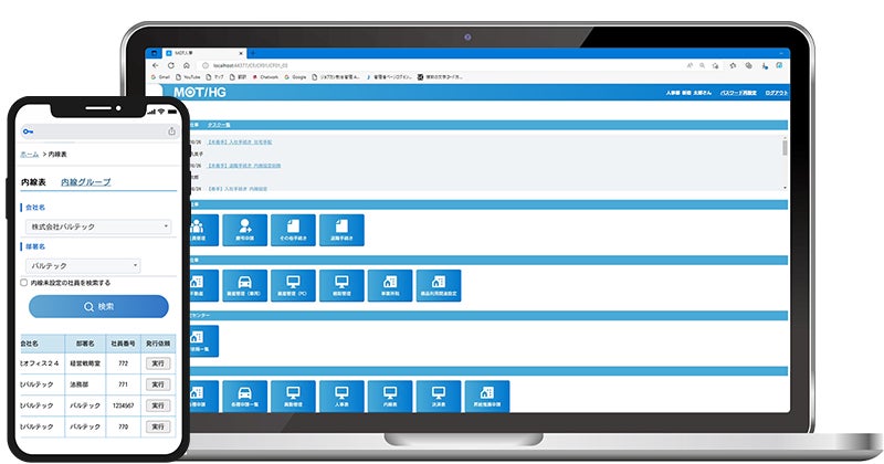 一般的なビジネスフォン機能に加え、インターネットFAX、ビジネスチャット、自動音声(IVR)や顧客情報の表示(CTI)といった機能を備えるほか、受付システム、勤怠管理、通話録音との連携も可能。3月にリリースされた人事総務システム「MOT/HG」により、社員DB、電話帳、PCなどの資産も一元管理できるようになりました。
