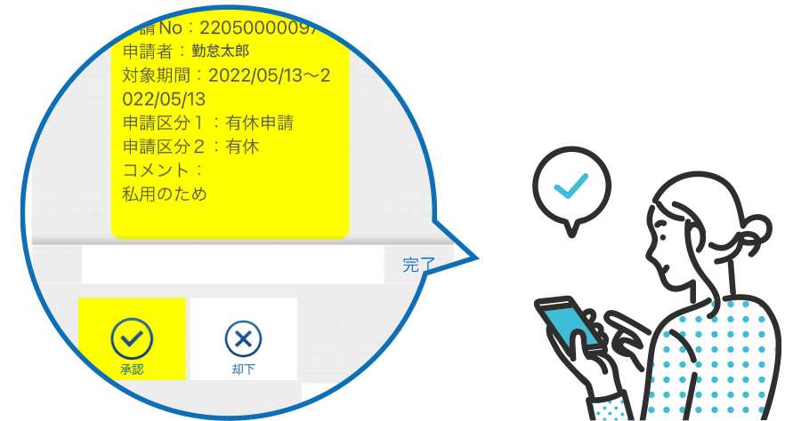 時間外勤務、有給など承認作業の度に行っていた管理画面へのログインが不要で、スマホアプリMOT/Phoneのチャット画面からそのまま簡単に決裁が可能になります。