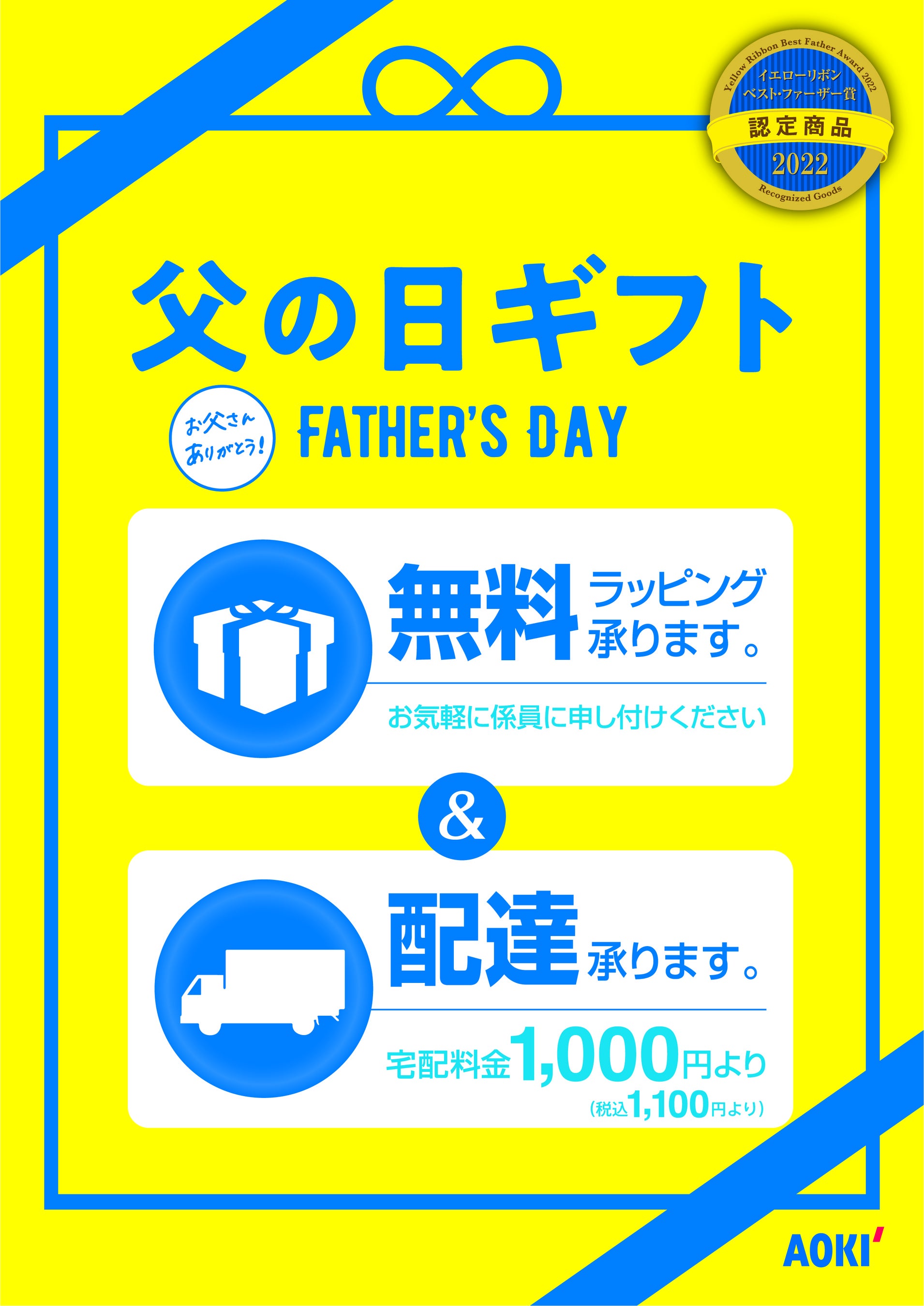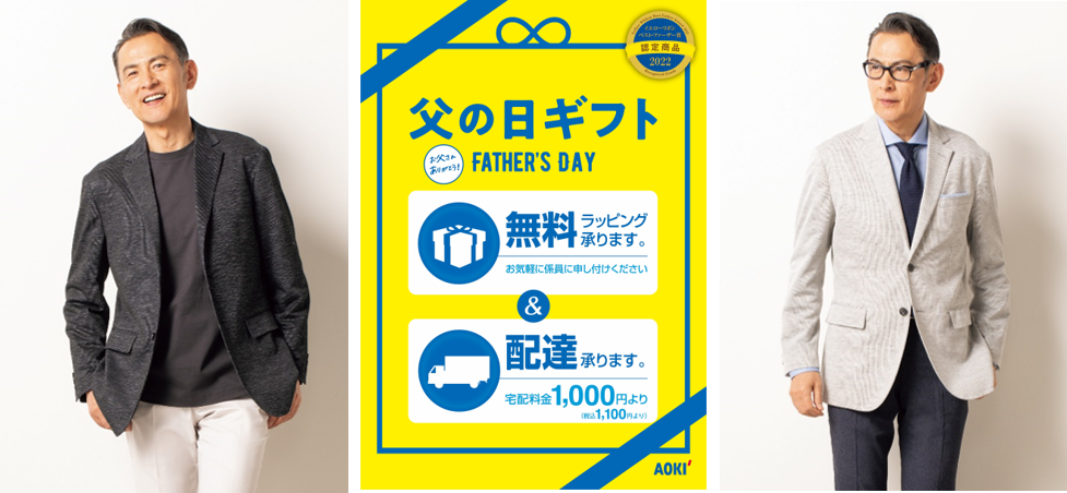 株式会社AOKI(代表取締役社長:上田雄久)は、6月19日(日)に迎える父の日のギフトとしてONでもOFFでもシーンレスに着用できる、高品質アイテムとしておすすめの「ノルマンディーリネン軽量ニットジャケット」「日本製ポロシャツ」「パジャマスーツ®」のご提案を強化いたします。全国のAOKI店舗ならびにAOKI公式オンラインショップではギフト用の無料ラッピングと全国へのご配送(有料)も承っており、遠方やコロナ禍でなかなか会えないご家族に洋服を贈ることで感謝の気持ちを伝えるお手伝いをさせていただきます。