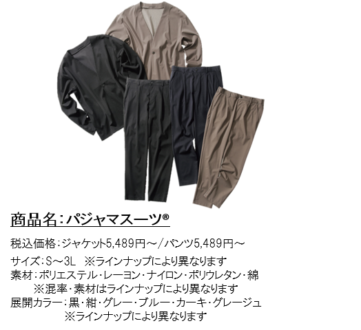 パジャマのような「リラックス感」とスーツのような「きちんと感」を両立させた「パジャマスーツ®」は、ビジネスシーンはもちろんおでかけ着にも最適です。ラインナップを拡充し、ジレタイプやカバーオールタイプなど幅広いシーンでお召いただけるアイテムを揃えております。